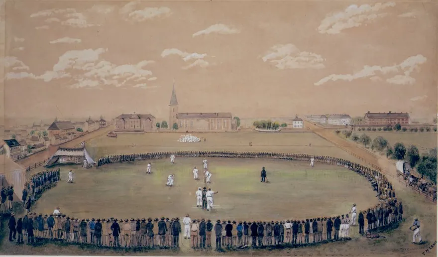 Thomas Harvey Lewis (1828 - 1901) has only one known painting, Hyde Park - the old days of merry Cricket Club matches, a cricket match that took place on 27 October 1843 between a local Sydney team and a team representing an Imperial regiment then stationed in Sydney. In the background the Supremen Court, St James' Church and Hyde Park Barracks can been seen.