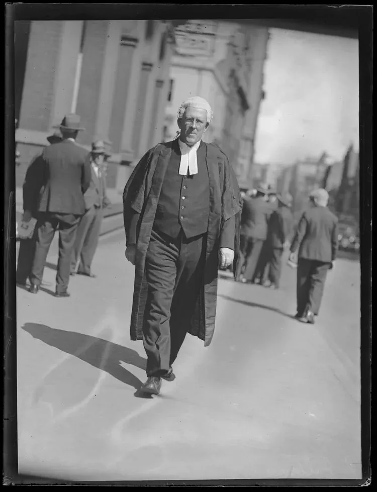 Percy Coleman outside the Supreme Court wearing a wig and gown, NSW